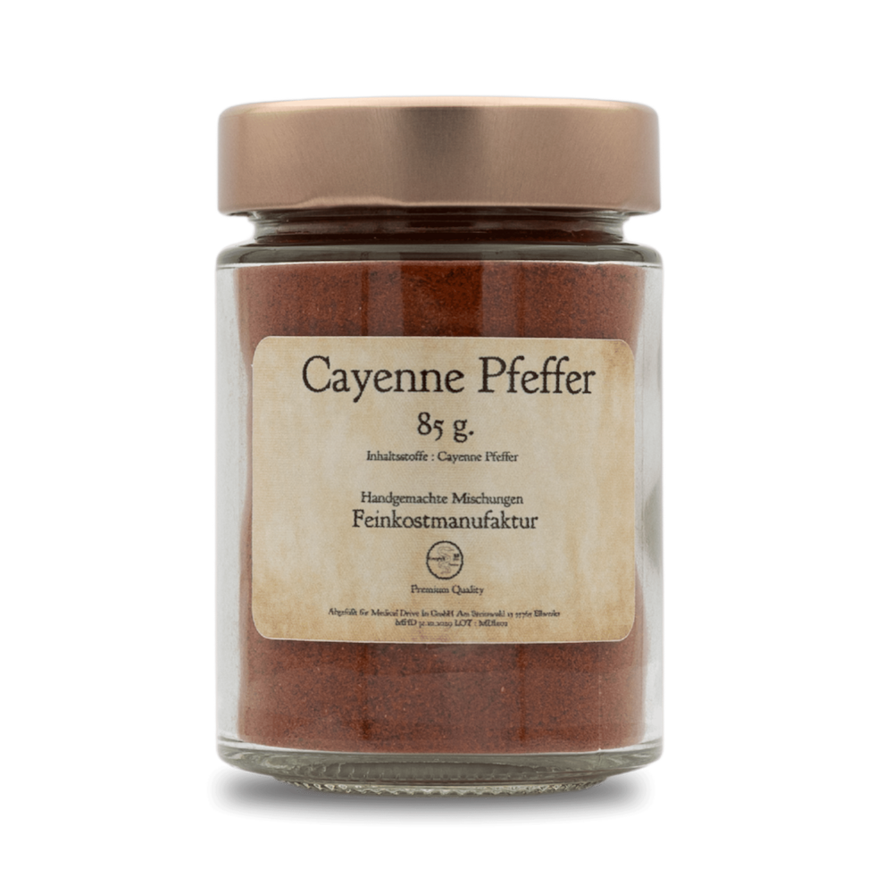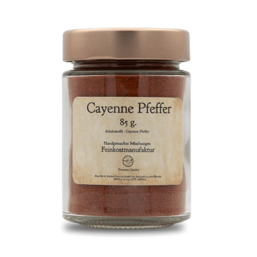 Cayennepfeffer ist ein scharfes Gewürz aus getrockneten und gemahlenen Chilis der Sorte „Cayenne“, benannt nach der südamerikanischen Stadt Cayenne. Er liefert intensive Schärfe und hat eine leicht rauchige Note