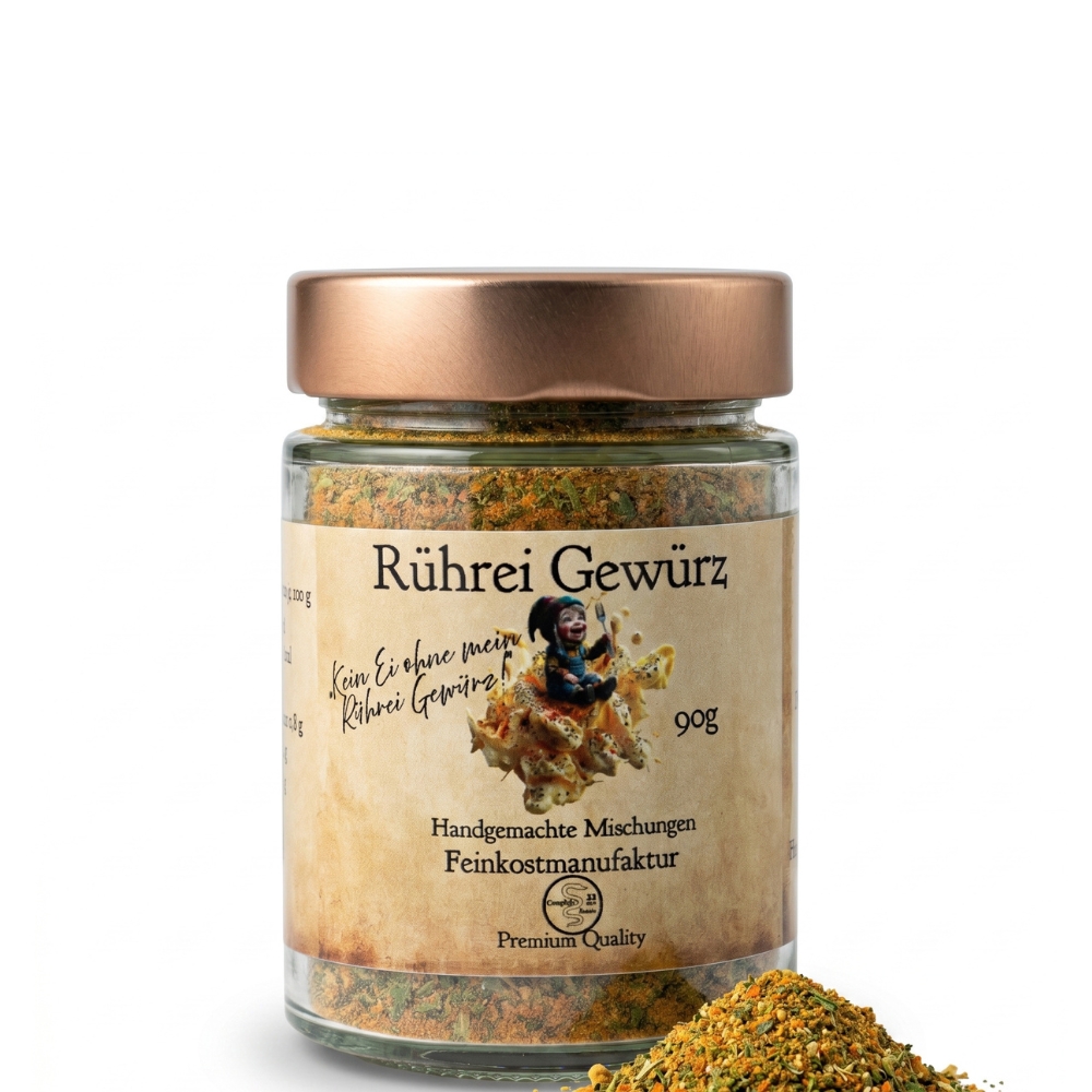 Das Rührei-Gewürz liefert mit /Zutaten wie Salz, Pfeffer,Muskat,Kurkuma,Zwiebeln und Schnittlauch das herzhafte Fundament