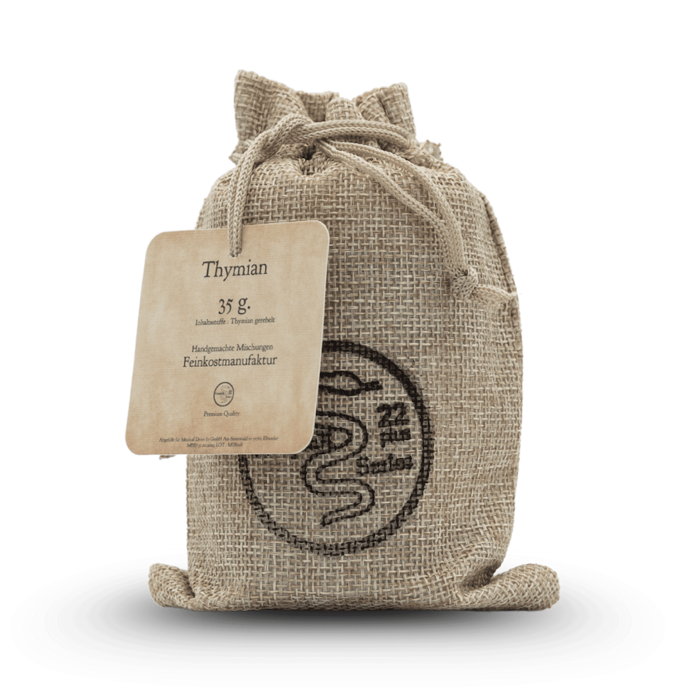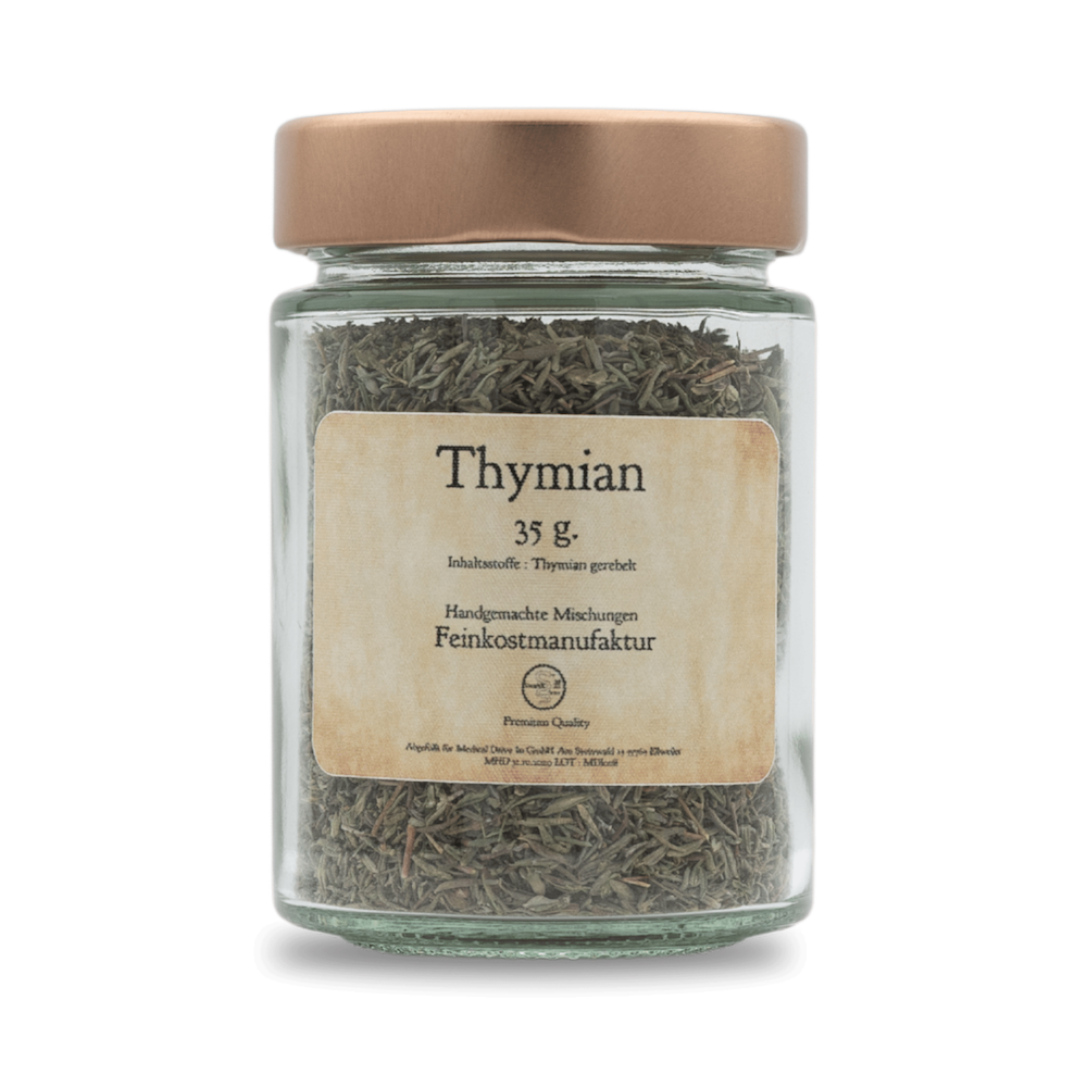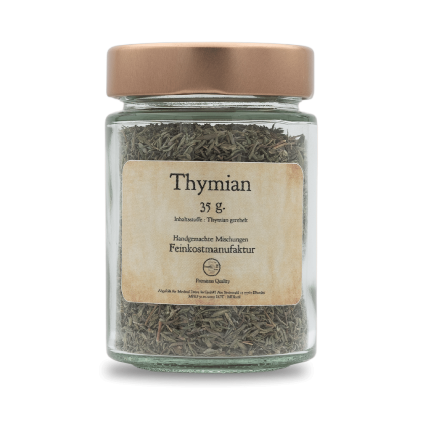 Thymian ist ein aromatisches Kraut, das in der mediterranen und europäischen Küche weit verbreitet ist. Mit seinen kleinen, graugrünen Blättern und seinem intensiven, würzigen Duft ist Thymian ein unverzichtbares Gewürz für viele Gerichte. Er gehört zur Familie der Lippenblütler und ist eng verwandt mit Oregano und Majoran. Thymian ist besonders beliebt für seine vielseitige Verwendung und die Fähigkeit, anderen Aromen eine zusätzliche Tiefe zu verleihen. Das Aroma ist holzig, erdig und etwas scharf.