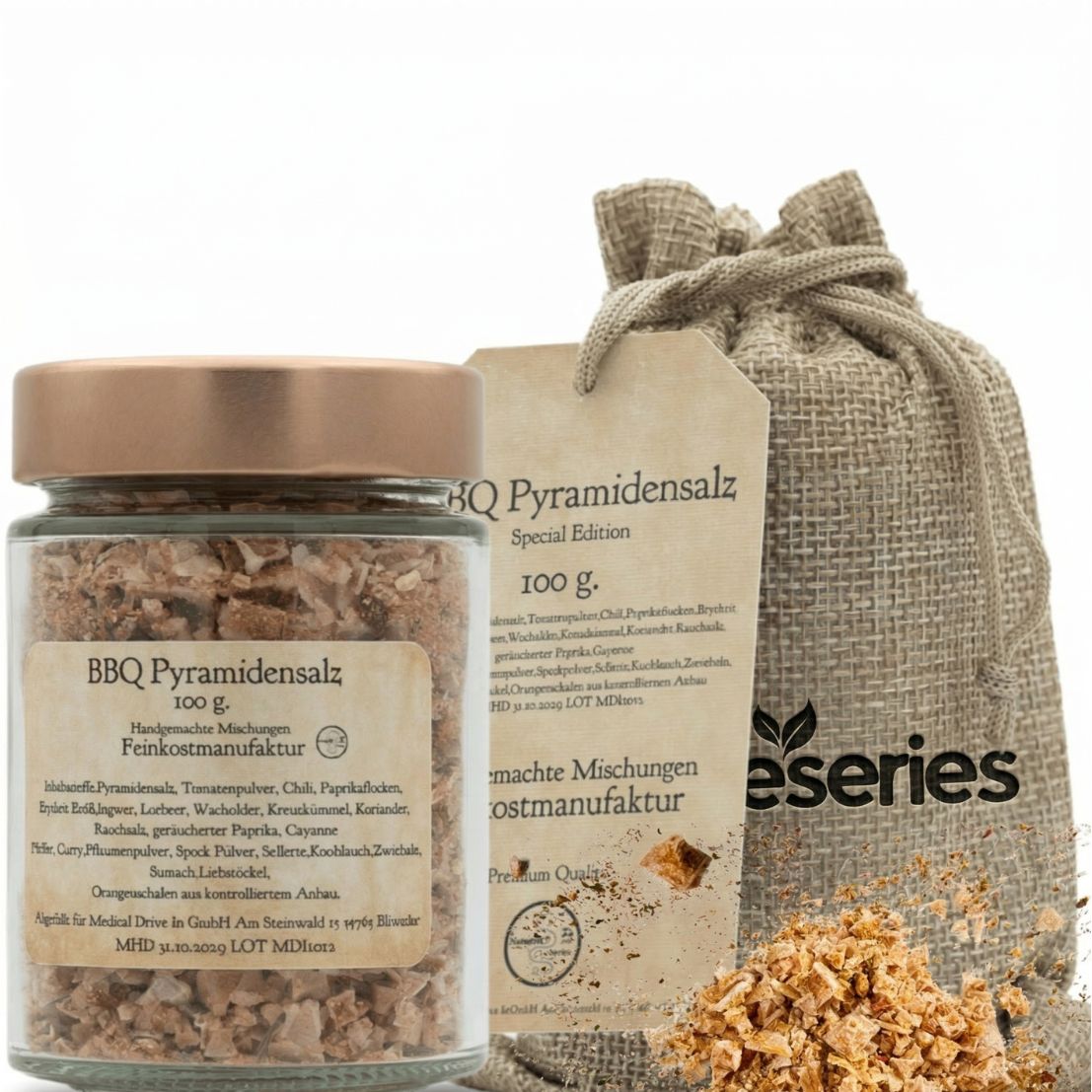 Tomatenpulver, Chili, Paprikaflocken, Erythrit (E968), Ingwer, Lorbeer, Wacholder, Kreuzkümmel, Koriander, Rauchsalz, geräucherter Paprika, Cayenne, Pfeffer, Curry, Pflaumenpulver, Speckpulver, Sellerie, Knoblauch, Zwiebel, Sumach, Liebstöckel, Orangenschalen (aus kontrolliertem Anbau)