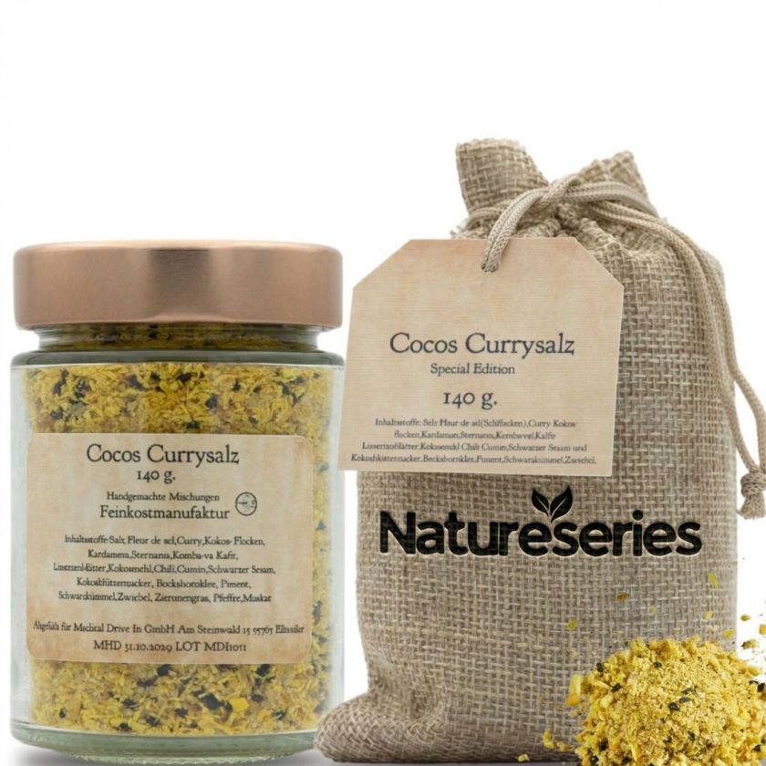 (Kaffir-Limettenblätter), Kokosmehl, Chili, Cumin, schwarzer Sesam, Kokosblütenzucker, Bockshornklee, Piment, Schwarzkümmel, Zwiebel, Zitronengras, Pfeffer,Muskat