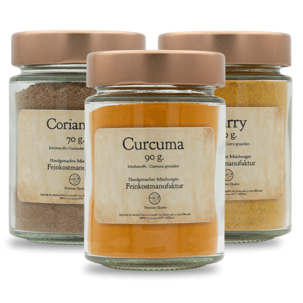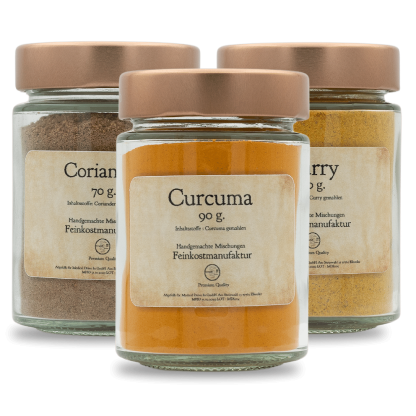 Curcuma bringt erdige Wärme und intensive Farbe, Coriander ergänzt mit würzig-holziger Frische, Curry verbindet beides zu einer runden, vielschichtigen Mischung. Gemeinsam entstehen Aromen, die satt, voll und ausgewogen wirken.