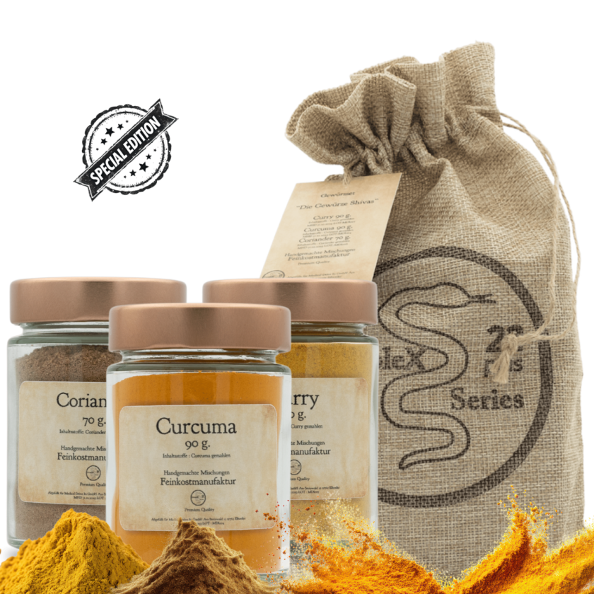 Die Gewürze Shivas vereinen Curcuma, Coriander und Curry zu einer klassischen, warmen Gewürzkombination mit klarer indischer Prägung. Die drei Gewürze stehen für Farbe, Würze und Tiefe und bilden eine ausgewogene Grundlage für aromatische Gerichte.