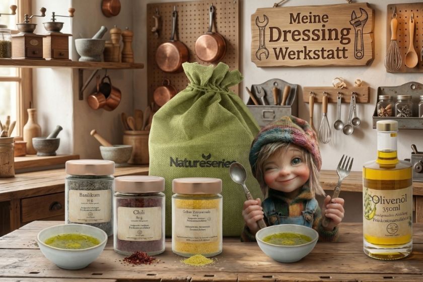 „Hand aufs Herz: Ein Salat ist immer nur so gut wie sein Finish. In unserer Dressingwerkstatt veredeln wir das Grünzeug. Ob der sanfte Kuss von Basilikum, ein sonniger Gruß vom gelben Sonnenscheinsalz oder der nötige Funke Chili – wir liefern die Werkzeuge, damit dein Olivenöl endlich den Auftritt bekommt, den es verdient.“